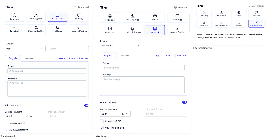 We also discovered that several components, like email, text message, and user verification actions, looked identical even when their states or purposes differed. Users asked for more flexibility – such as adding multiple recipients or combining multiple actions – but due to feasibility constraints, we started by implementing multi-recipient functionality.
