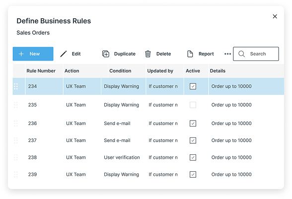 Press on the “define Business Rules” will open the list of exist rules (if we have rules for this screen)